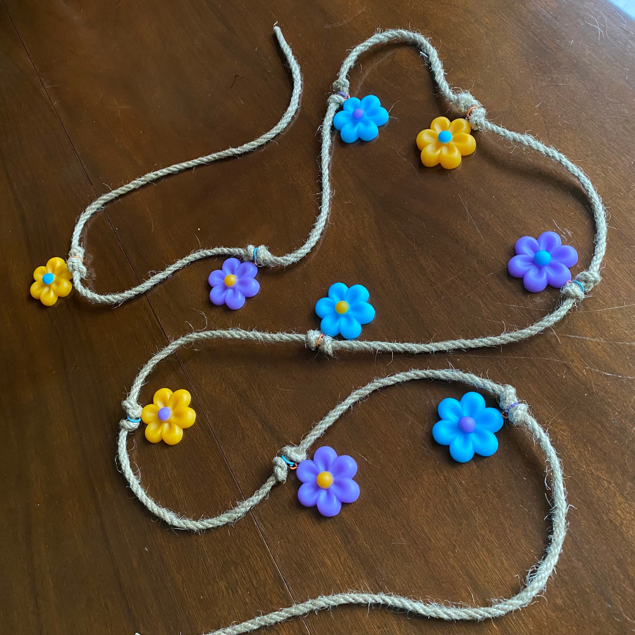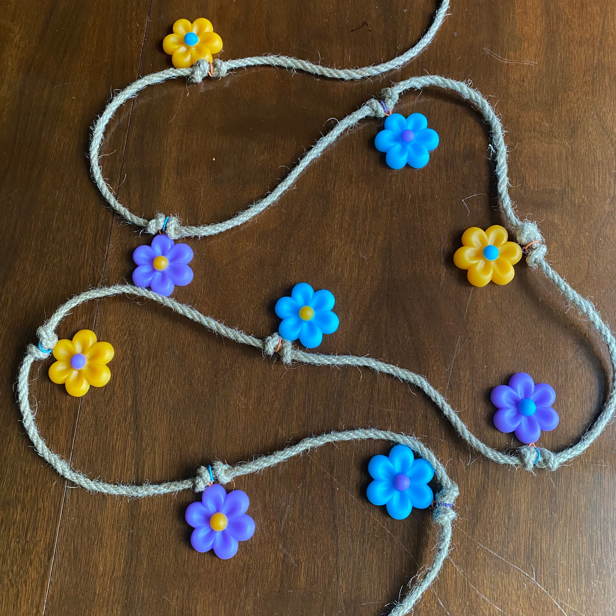 This garland is apx 85” long and has purple, blue and orange flowers!